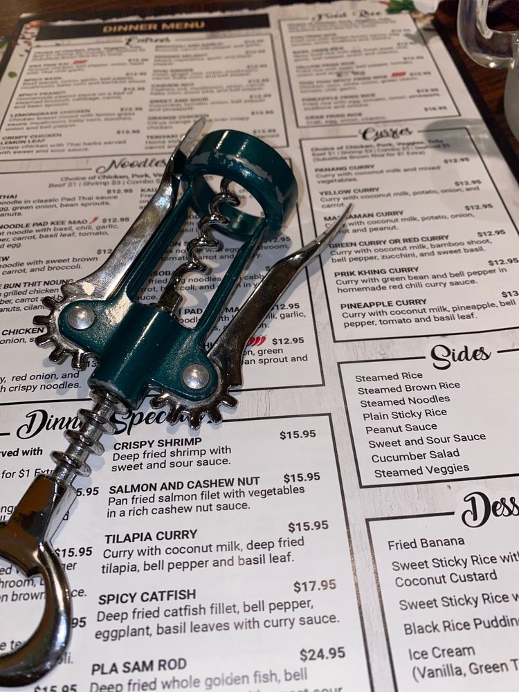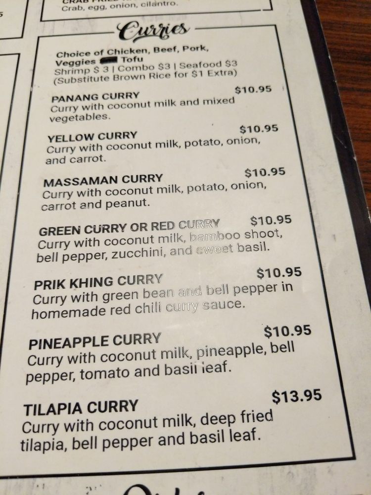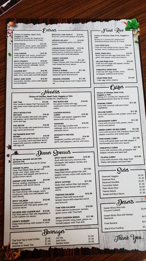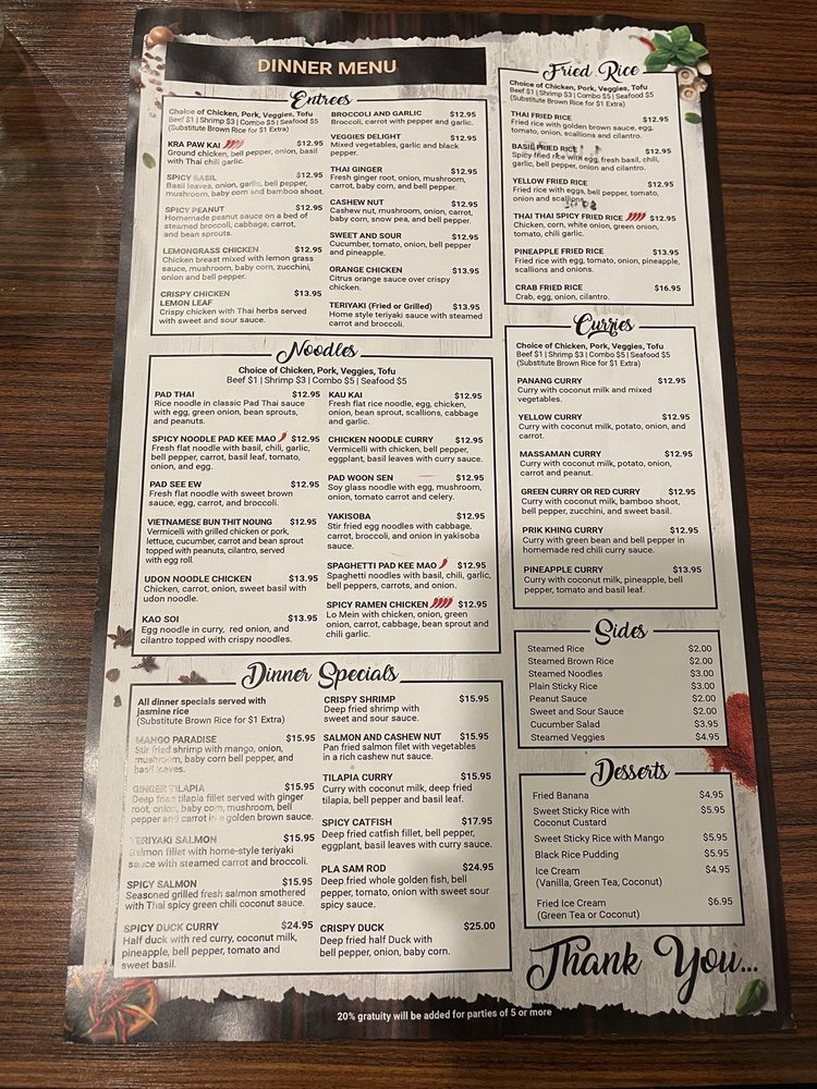 The menu features a variety of fried rice options and tantalizing noodles like Spicy Noodle Pad Kee Mao and Kao Soi. For those craving a hearty meal, the dinner specials include Spicy Crispy Duck Curry ($26.95) and Whole Red Snapper ($45.00).