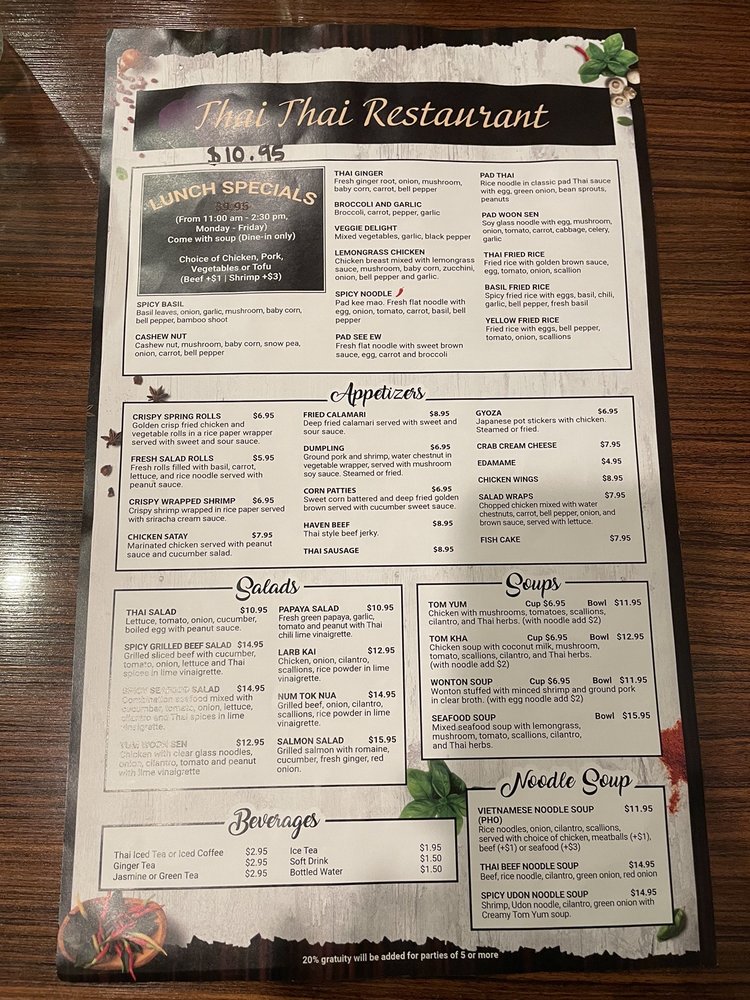 Welcome to Thai Thai Restaurant, located at 1731 Greenville Ave, Dallas, TX 75206. This charming eatery offers a delightful array of authentic Thai dishes that capture the essence of the vibrant cuisine. From the classic Pad Thai ($14.95) to the rich and flavorful Pineapple Fried Rice ($15.95), there’s something to please every palate.